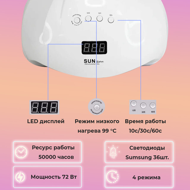 Призначена для полімеризації для всіх типів гель-лаку та всіх різновидів гелів. Її потужність 72 ватів — дає змогу просушити навіть проблемні гель-лаки.